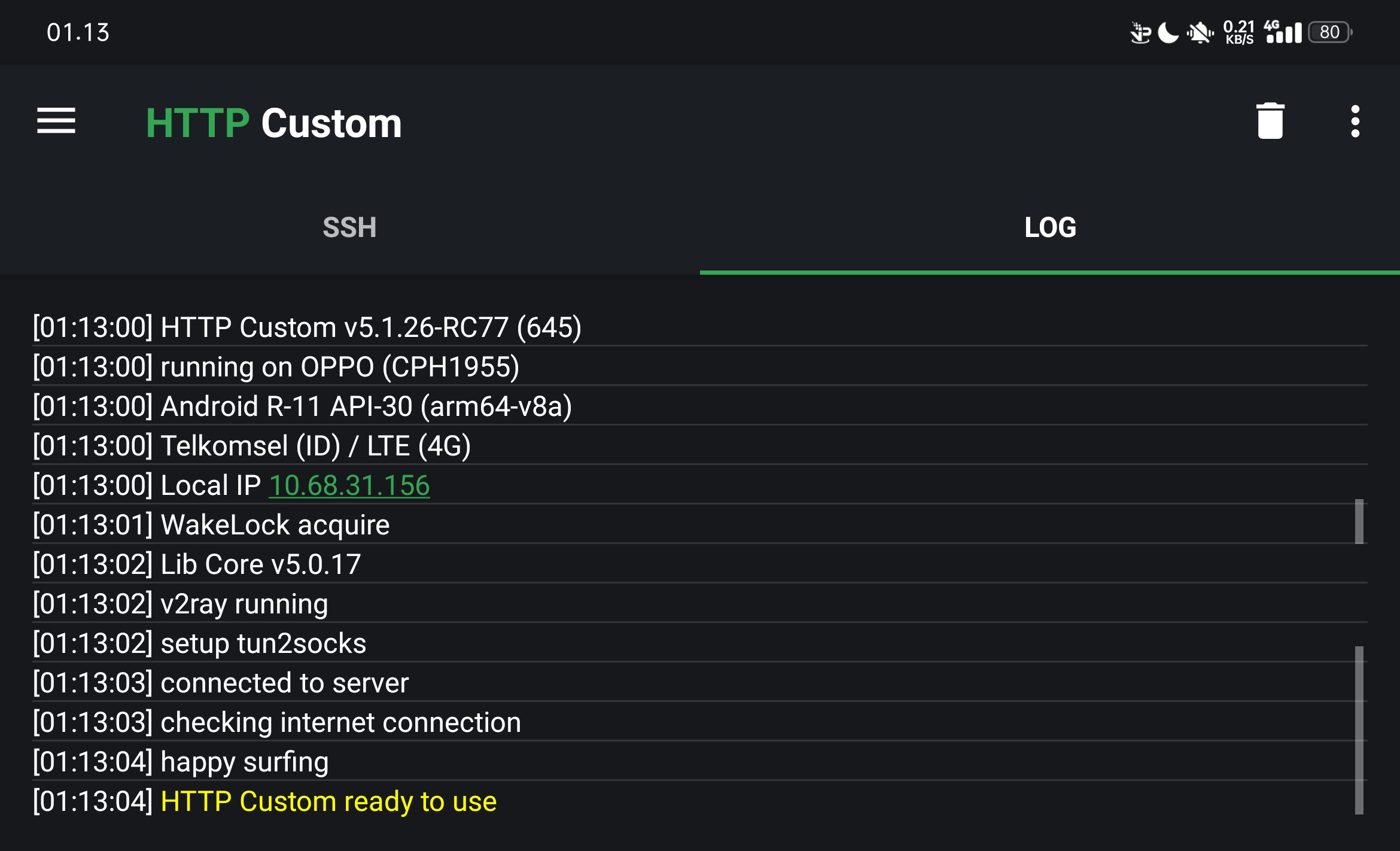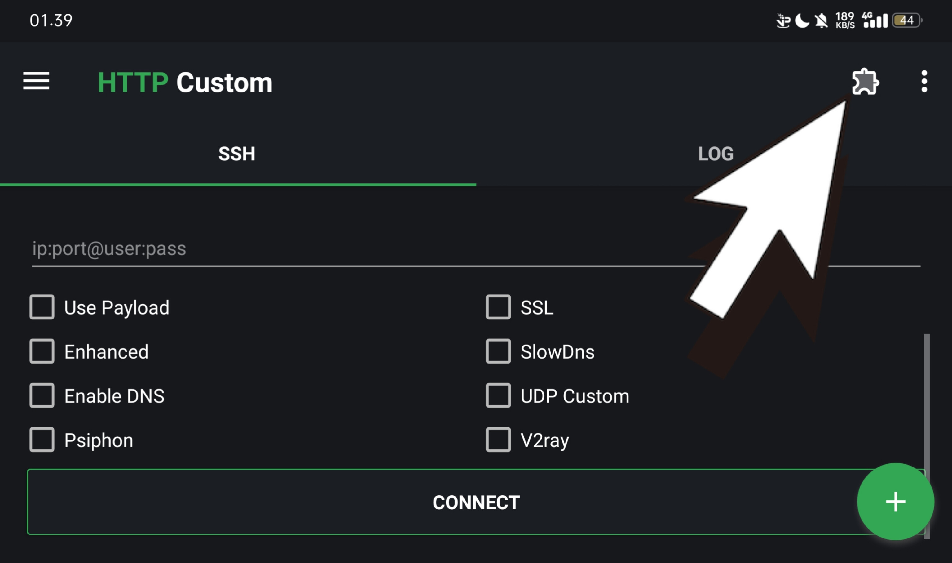 Selanjutnya tinggal klik connect. Terus liat di menu LOG apakah sudah konek. Kalau ada tulisan kuning. HTTP Custom ready to use