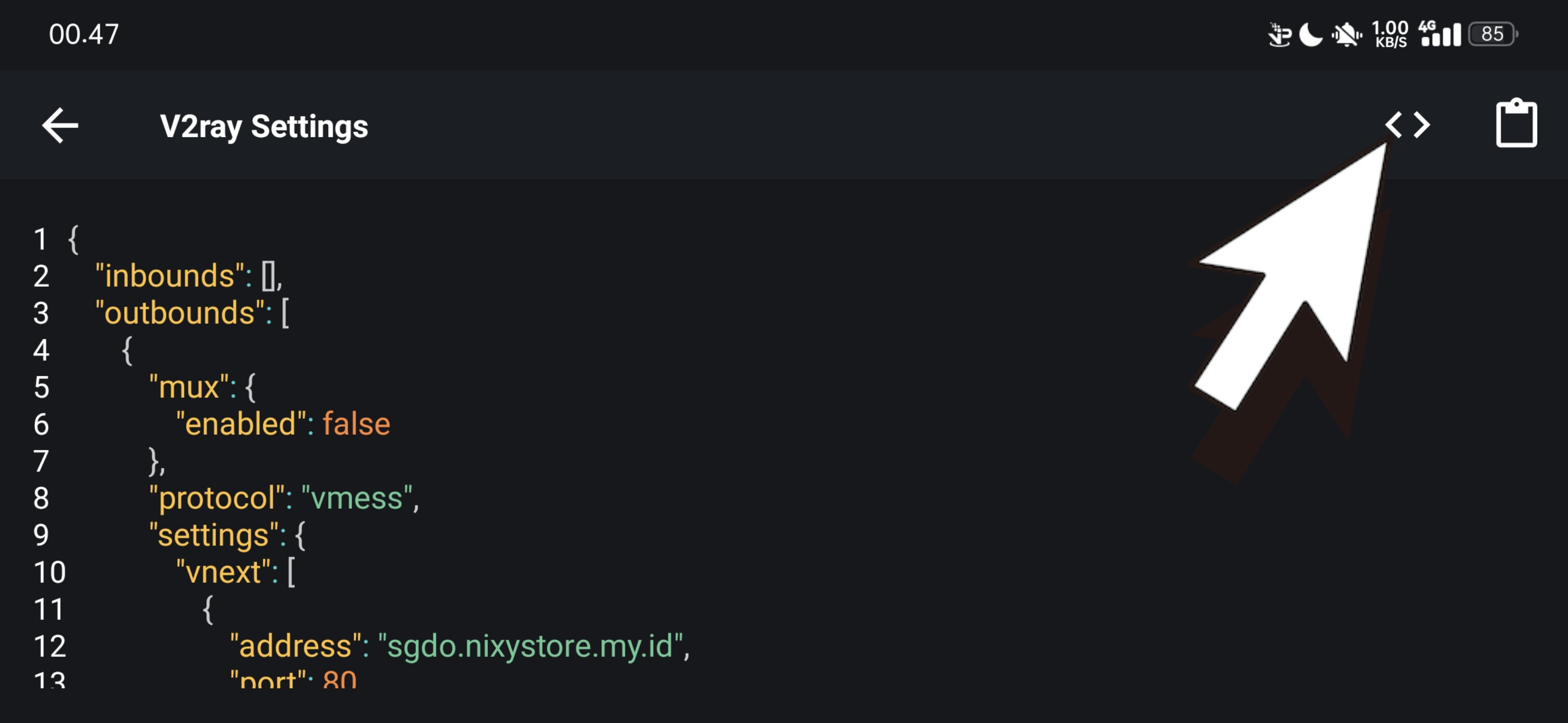 Kalau udah nanti akan di arahkan ka menu v2ray Settings Nah Kalau udah di meun ini, Tinggal paste/tempel akun v2ray yang udah kita buat atau beli, caranya kli tombol yang ada di gambar atas. Nah Kalau belum tau mana yang harus di copy contohnya format nya sebagai berikut :