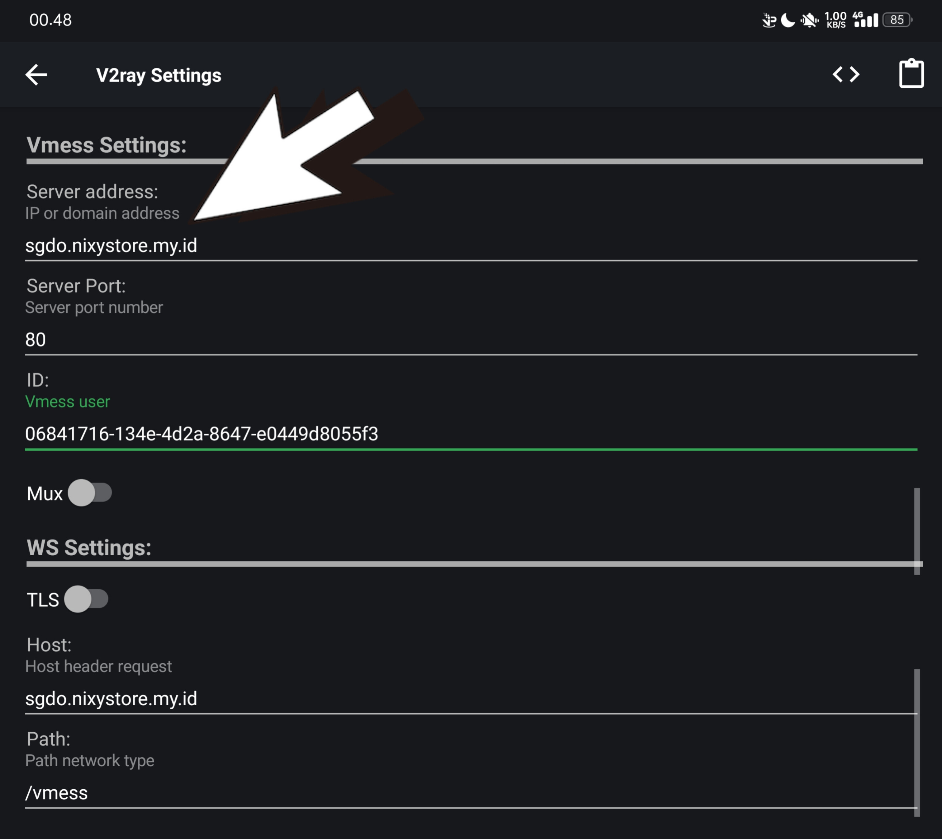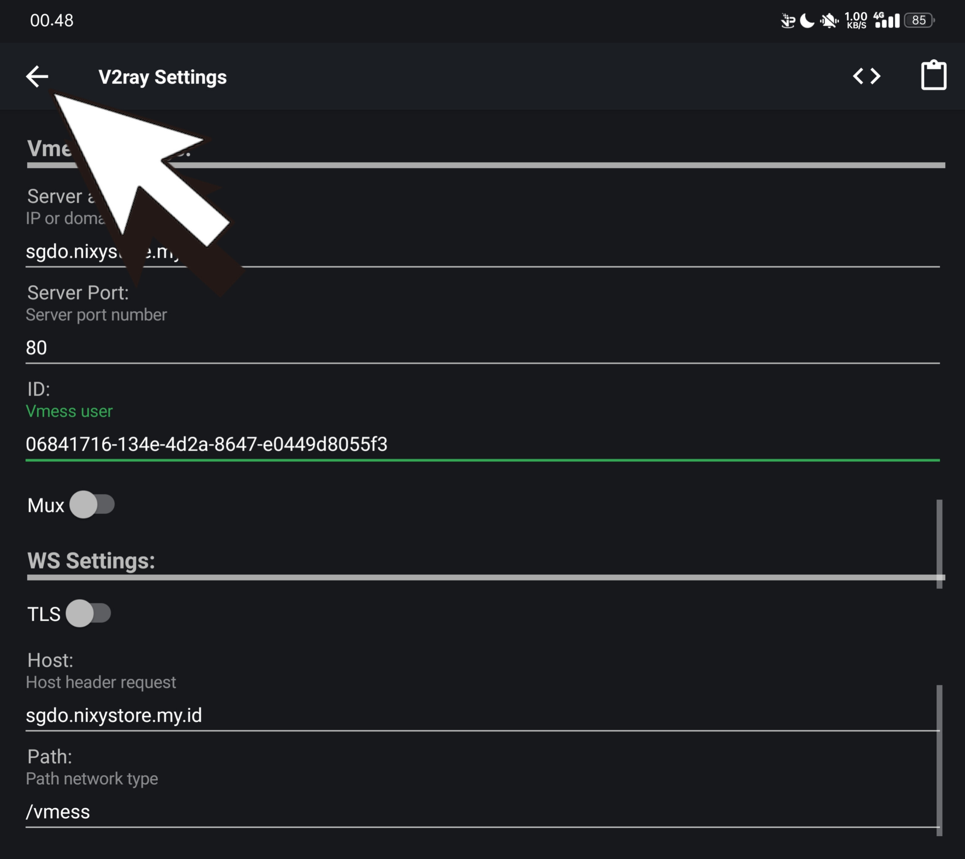 Nanti akan di arahkan ke menu settings, Selanjutnya tinggal ubah BUG/PROXY nya, cara ubah BUG/PROXY hapus hostname yang udah kasih petunjuk di gambar atas, Untuk bug v2ray di http custom cuman ip aja. Contoh nya sebagai berikut :